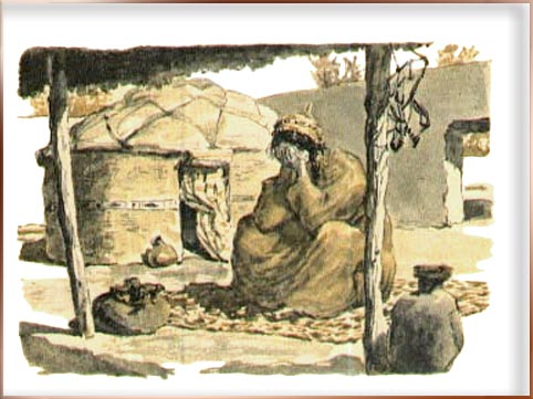 Однажды утром старуха намолола ячменной муки на ручной мельнице, замесила тесто на кислом молоке, развела жаркий огонь в глиняной печке-тамдыре и испекла три пышные лепёшки. Она помазала их сверху хлопковым маслом, уложила в чашку, чашку завязала в чистый платок и стала надевать туфли-ичиги.