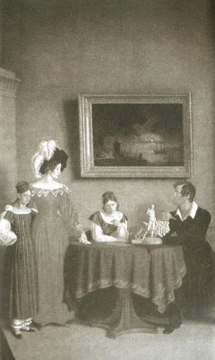 Иллюстрация к «Евгению Онегину».Гравюра на меди М. А. Ивановас оригинала А. В. Нотбека. 1828 г.