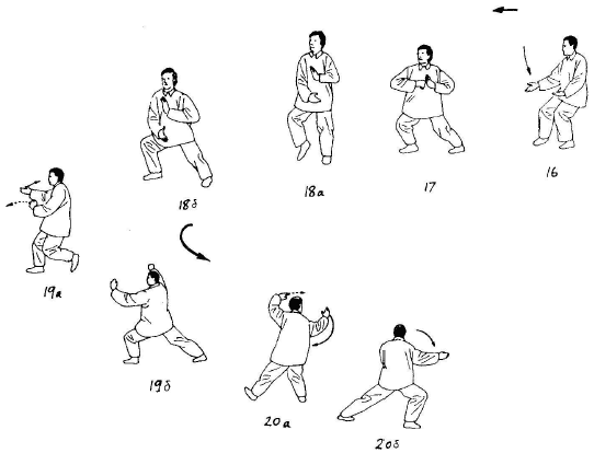 11. Перекрещенные руки. 12. Отвести тигра назад, к горе. 13. Наклонный кнут. 14. Наблюдать из-под локтя. 15. Отражающая обезьяна. 16. Полет по диагонали. 17. Поднятие рук.