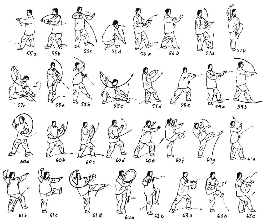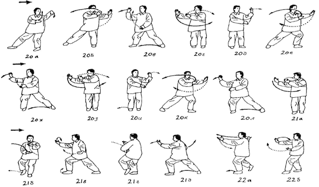 49. Застрелить тигра. 50. Удар ладонью в лицо. 51. Удар кулаком снизу. 52. Погонять лошадь. 53. Единство тай-цзи.