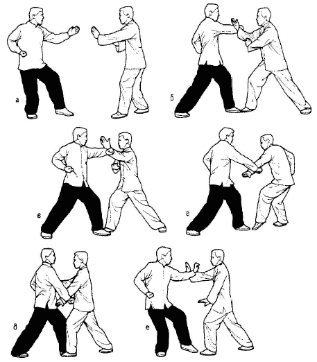 Некоторые школы демонстрируют невероятную жестокость и враждебность, даже во время тренировочных спаррингов (поединков) между учениками. Совсем не редко можно услышать, как тот или иной инструктор выкрикивает нечто вроде: «Врежь ему, убей его!» Поэтому не удивительно, что подопечные такого «специалиста» покидают занятия в синяках и ушибах, затаив высокомерие и ненависть в сердце. Неприемлемая практика такого рода полностью отсутствует на занятиях по тай-цзи цюань вовсе не потому, что приверженцы этой школы рождены более гуманными людьми, но вследствие того, что сама суть тренировочного процесса направлена на достижение спокойствия, а агрессивные и эгоистические мысли ученика будут работать против него самого. Исследования, проведенные в области механики и психологии процессов обучения в различных школах боевых искусств, дали совершенно разные результаты. По сравнению с тай-цзи другие школы в поединке делают упор на механическую силу и скорость. В случае, когда во время схваток удар не блокируется или защищающийся уклоняется от него, сила и инерция таковы, что атакующий не в силах удержать бьющую ногу или руку, и атака производится со всей жестокостью. В основу базовой стратегии таких школ положено стремление как можно сильнее и быстрее поразить противника, почти не обращая внимание на собственную безопасность. Обе стороны концентрируются на атаке и обычно наносят друг другу множество ударов. Психология таких бойцов заключается в стремлении поквитаться ударом на удар. Желание мести формирует философию такого боя, когда вне зависимости от того, кто твой противник, доминирует желание во что бы то ни стало поразить его. Подобный образ мысли восходит ко временам, когда воин считал за честь убить кого бы то ни было, будь то его собственный отец, лишь бы был приказ повелителя. Динамика и философия тай-цзи цюань не имеют ничего общего с вышеупомянутым подходом. Базовая стратегия боя тай-цзи состоит в том, чтобы следовать движениям противника, для чего участнику схватки необходимо спокойствие и ясность мысли; в противном случае он не сможет применить свое искусство эффективно. Сила удара определяется в данном случае не силой инерции, а потоком внутренней энергии, освобожденной в момент контакта. В спарринге это означает, что в ответ на случайный удар партнер не встретит жесткого противодействия. Более того, сам подход к проведению спарринг-контактов в тай-цзи цюань принципиально отличается от позиций других школ боевых искусств. Вместо обмена ударами ученики формируют свои навыки по специально разработанной методике, известной как «толкающие руки», суть которой заключается в том, что руки соперников вступают в «мягкий» контакт в результате серии ритмических движений. Целью такой тренировки является определение слабых мест противника, например незащищенного участка или момента потери равновесия спарринг-партнером. Таким образом, во время учебного боя оппоненты не получают повреждений. Не менее важно помнить о том, что эта методика предполагает следование не только движениям партнера, но и его мыслям и чувствам! Противника повергают в тот момент, когда он выведен из душевного равновесия, чем-то озабочен или чувствует неуверенность. Более подробно о технике «толкающих рук» будет рассказано позднее. Сама философия иск