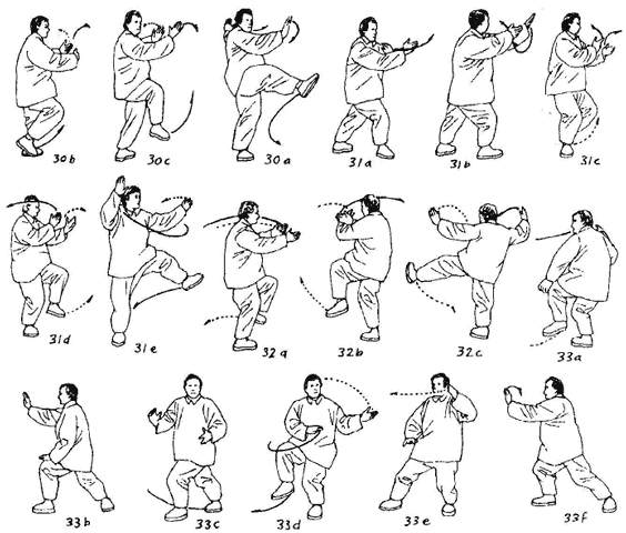 30. Удар кулаком вниз в движении вперед. 31. Двойной удар ногой с поворотом. 32. Приручение тигра. 33. Прямой удар левой ногой. 34. Прямой удар правой ногой.