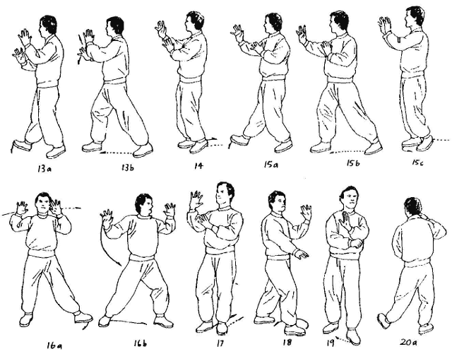 13. Отвести тигра назад, к горе. 14. Игра на лютне. 15. Ленивый закатывает рукава. 16. Кнут. 17. Поднятие рук. 18. Удар ладонью в лицо. 19. Наблюдать из-под локтя.