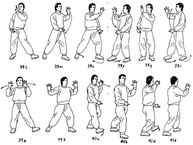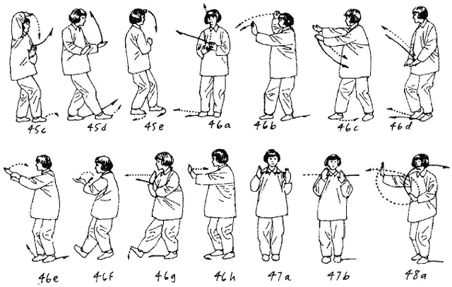 39. Одинокий золотой петушок. 40. Кнут. 41. Удар ладонью в лицо. 42. Развернуть склонившийся лотос скрещенными руками. 43. Удар кулаком в живот. 44. Низкая стойка. 45. Семь звезд. 46. Верхом на тигре. 47. Удар ладонью в лицо. 48. Развернуть низко склонившийся лотос.