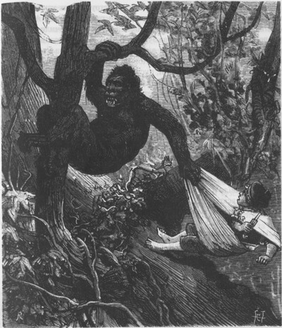 С ружьями наготове, не отрывая глаз от земли, оба француза двинулись в обход и вскоре скрылись из виду, затерявшись, как мелкие муравьи, среди гигантских стволов, обступивших их со всех сторон. Андре вскоре напал на след. Это было нетрудно, так как на мягкой почве тяжелые ступни гориллы оставляли глубокий след; Андре насчитал десятка два следов. Страшилище все время волочило Фрике по земле, очевидно ухватив его за бурнус. Вдруг молодой человек не смог подавить крика отчаяния при виде двуствольного ружья с разбитым прикладом под громадным баньяновым деревом (фикусом), ветви которого, склонившись до земли, пустили корни, образовав таким образом целый ряд тонких зеленых колонн вокруг своего громадного ствола, достигавшего более десяти метров в окружности. Это дерево занимало собой пространство, на котором мог бы расположиться целый полк. Оба ствола ружья были разряжены; значит, Фрике успел выстрелить вторично из своего ружья, а затем еще выпустил один заряд из своего револьвера. Конец ствола был значительно сплющен, словно был зажат в железные тиски. Несомненно, эти рубцы и зазубрины были оставлены на дуле зубами гориллы. В тот момент, когда Андре крикнул, доктор со всех ног бросился к нему. При виде изуродованной двустволки и он не мог удержаться от горестного вскрика. — Несчастный мальчик! — воскликнул он. — Мужайтесь, — успокоил Андре, — я не могу поверить, что его больше нет в живых! — Как бы то ни было, мы должны найти его! — решил доктор, призвав на помощь все свое мужество. Оба стали вместе осматривать каждую травинку. — Посмотрите, доктор, видите в этой лиане круглое отверстие величиной с горошину, из которого сочится сок?! — Да, вижу. Можно подумать, что это след пули. — Да, да! — продолжил Андре и срезал ножом лиану как раз над тем местом, где было отверстие, причем в глубине этого отверстия оказался кусок рубленого свинца. — Бедняга, у него ружье было заряжено картечью. — Как знать, — возразил доктор, — быть может, это спасло его. Для стрельбы на столь близком расстоянии я сам предпочитаю картечь пуле. Вы знаете, что прославленный Бомбоннель[7] никогда не стрелял в своих пантер иначе, как только картечью, и, быть может, это случайное обстоятельство помогло нашему мальчугану избавиться от страшного чудовища. — Ах, если бы это действительно было так! — Смотрите, ведь он стрелял в упор! Видите эти несколько черных волосков? Это клочок шерсти гориллы; они пристали ко второй круглой дырочке, где также засела картечь. Фрике, как видно, стрелял машинально, и выстрел не ранил гориллу смертельно, не попал в цель, так как иначе он убил бы ее наповал этим зарядом. Во всяком случае, он ранил ее серьезно, я полагаю, так как других следов картечи я не вижу, следовательно, весь остальной заряд пришелся в обезьяну. — Очевидно. — Смотрите, я был прав; видите вон тут, на высоте человеческого роста, это помятое место на лиане, еще сохранившее след окровавленной ладони величиной вдвое больше ладони Фрике? Это след ладони гориллы. — Дайона ухватилась за этот корень, как за точку опоры… Но все же мы не знаем, где наш мальчуган. — Терпение, друг мой! Терпение! Мы уже знаем, что животное ранено, значит, оно не может быть далеко. В этот момент галамунды подошли со всех сторон, а вслед за ними и Ибрагим со своими абиссинцами, которого сразу же ознакомили с положением