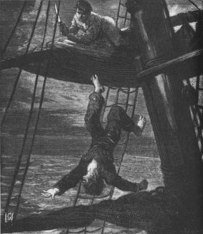 Как человек ловкий и предусмотрительный, он не вынул ножа из раны, чтобы избежать кровоизлияния; кровавые капли, падающие с реи, могли бы выдать его; и вот он осторожно добрался до самого конца реи, таща за собой тело матроса, затем, напрягши все свои силы, столкнул труп прямо в море в момент наклона судна. При звуке падения тела в воду раздался знакомый в море громкий возглас: «Человек за бортом!» Вахтенный матрос на корме одним ударом топора перерубил канат спасательного буйка. Когда судно в море, то у него на корме всегда находится громадный буек, у которого днем и ночью стоит дежурный вахтенный матрос, вооруженный топором. Ему отдано приказание, как только раздастся крик: «Человек за бортом!», немедленно перерубить канат, удерживающий этот буек над водой. Судно тотчас же ложится в дрейф, но так как оно не может остановиться сразу, то спасательный буек прикрепляется к нему длинным тросом, позволяющим буйку держаться на очень большом расстоянии от судна. Кроме того, человек, оказавшийся в море вследствие вздымающихся между ним и спасательным буйком волн, мог бы легко потерять его из виду, но последний снабжается особым механизмом, благодаря которому при падении буйка в воду из него выкидывается флаг. Он днем далеко виден и служит указанием места нахождения буйка, а ночью вместо флага зажигается огонь, горящий в продолжение получаса и вспыхивающий благодаря тому же приспособлению, которое днем выкидывает флаг. Итак, спасательный буек упал в воду, и огонь зажегся. Страшная ругань посыпалась из уст вахтенного офицера. — Как? Да ты хочешь, чтобы всех нас перевешали? Разве ты не знаешь, что мы не должны зажигать установленных огней при нападении… а факел горит… и указывает этому мерзавцу-крейсеру наше местонахождение! — Но, капитан, человек за бортом!.. — Ну и пусть сдохнет там! Черт бы его побрал! Скорее вытаскивай буек наверх и гаси факел! Провинившийся матрос поспешил тотчас же исполнить приказание и мокрой шваброй погасил факел. И это было как раз вовремя: на горизонте мелькнула вспышка, и крупный снаряд, пущенный одним из метких наводчиков с «Молнии», со свистом пролетел над палубой и снес гик бригантины. — Счастье, что мы идем с помощью машины, — холодно и спокойно заметил капитан, — а то бы этот дуралей испортил нам игру. Фрике тем временем проворно слез сверху и с самым спокойным видом, как будто ровно ничего не случилось, смешался с другими матросами, рассуждавшими на все лады о случившемся, причем никто не подозревал настоящей причины несчастного случая. «Уф! — мысленно восклицал Фрике. — Хорошо же я отделался… Вот компания-то подобралась, настоящие каторжники!.. К счастью, я скоро от них удеру… Погодите, голубчики… недолго вы на меня будете любоваться… Эх, если бы они только не засадили моего братца, я бы им показал!..» Ни одна душа даже не подозревала о той страшной борьбе, которая только что происходила там, на рее, и окончилась победой маленького парижанина благодаря его смелости, находчивости и присутствию духа. Некоторые матросы смутно видели падение в море человека, которого вахтенный офицер отказался спасать из-за грозившей судну серьезной опасности. Ну и что из того? Великое дело, гибель одного какого-то матроса!.. Подумаешь, одним человеком больше или меньше?! Что же касается крика «Сантьяго!», то его как будто никто не 