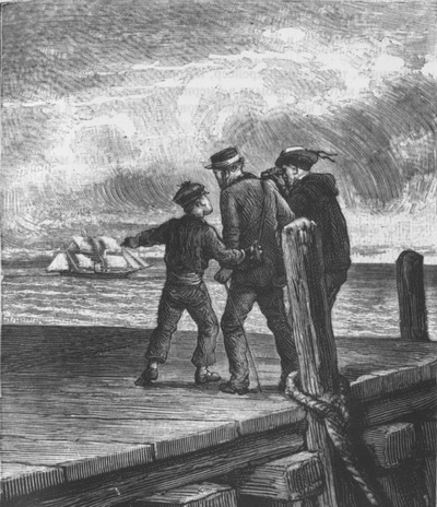Решено было завтра же уведомить Буало о встрече трех друзей. На всякий случай ему отправили с гонцами два письма к индейцам; кроме того, с первой почтой, отправлявшейся в Буэнос-Айрес, шел подробный рассказ о всех последних событиях с соответствующими инструкциями. Ему назначили свидание через три месяца и обещали в назначенный срок ожидать его прибытия. Затем трое друзей принялись составлять дальнейший план кампании по освобождению Мажесте и отправились в Вальпараисо, горячо поблагодарив консула за его внимание и любезность. Из Сантьяго до Вальпараисо пять часов пути по железной дороге. Но наших французов ожидал еще целый ряд неожиданностей. Едва только они прибыли в Вальпараисо, как отправились посмотреть рейд. «Молния», тот славный крейсер, которым командовал капитан де Вальпре и на котором прибыли в Америку доктор Ламперрьер и Андре, стояла здесь на якоре, готовясь снова выйти в море, в погоню за морскими разбойниками. Ее доблестный командир не пренебрег ничем, даже и тем туманным указанием, каким мог служить услышанный им крик мальчугана: «Сантьяго!», вследствие чего и пришел на своем корабле в Вальпараисо, ближайший к Сантьяго порт. Сейчас мы увидим, насколько он был прав, поступив таким образом. В тот момент, когда наши друзья собирались уже сесть в шлюпку, которая должна была доставить их на крейсер, Фрике на минуту замешкался на набережной, и вдруг ноги его точно приросли к месту. С якоря снималось судно. Красивое, легкое судно с высокими стройными мачтами и высоко поднятой кормой, окрашенное в красивый темно-бордовый цвет. — Тысяча чертей! — закричал гамен. — Да ведь это оно! — Кто? Что? — Скорее, друзья!.. Ради бога, скорее на крейсер… на «Молнию»!.. Не то этот разбойник уйдет от нас! — кричал Фрике, неимоверно волнуясь. — Да ты с ума сошел! — Да разве вы не видите… что это трехмачтовое судно, черный пират оно и есть!.. Он опять переменил название и внешний вид, но это он, я тотчас же узнал его… Это невольничье судно… Проклятый корабль морских бандитов!..— Тысяча чертей! — закричал гамен. — Да ведь это оно!