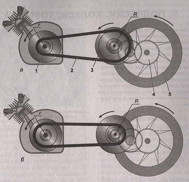 Схема передачи крутящего момента в трансмиссии скутера с клиноременным вариатором: а — положение трогания; б — положение движения со скоростью, близкой к максимальной; 1 — ведущий шкив; 2 — ремень; 3 — ведомый шкив; 4 — шестерни заднего редуктора; 5 — колесо; r и R — рабочие радиусы ведущего и ведомого шкивов вариатора