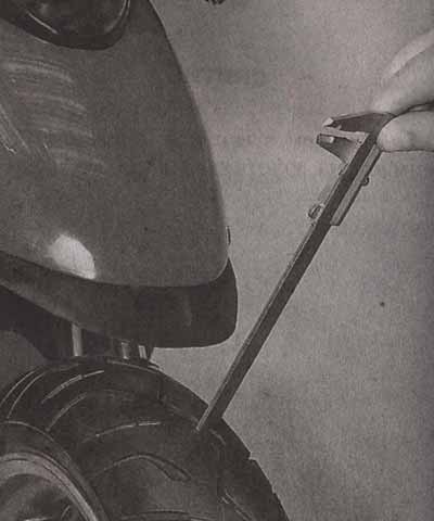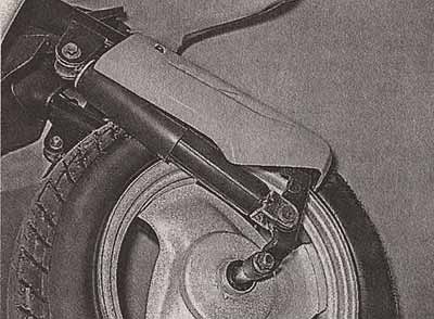 • Устанавливаем скутер на центральную подставку так, чтобы переднее колесо оказалось вывешено. Если скутер не занимает такое положение самостоятельно, можно попросить помощника сесть в седло, чтобы загрузить заднюю часть машины, или просто положить на седло или багажник тяжелый предмет. Главное, чтобы скутер не упал.