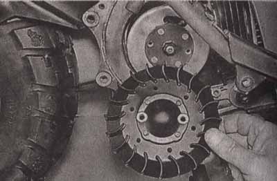 Сцепление так же, как и прочие узлы трансмиссии, после увеличения мощности двигателя нуждается в обязательной перенастройке. Момент срабатывания сцепления, также, как и вариатор — обычно настраивают на значение оборотов, соответствующее максимальному крутящему моменту. Таким образом, обеспечивается наиболее эффективное троганье с места и разгон. Если сцепление будет срабатывать раньше этого момента, двигателю просто не хватит мощности и момента, чтобы стронуть скутер с места, если позже — мы снова получим рывки и провалы в динамике разгона, плюс потерю части рабочего диапазона двигателя, который останется в «холостом» секторе тахометра. Настройка сцепления осуществляется подбором жесткости пружин, стягивающих колодки. Сцепление работает по инерционному принципу: вращаясь, благодаря центробежной силе, колодки расходятся и прижимаются к «колоколу» — ведомому барабану сцепления. Пружины, в свою очередь, противодействуют расхождению колодок, таким образом, изменяя жесткость пружин (заменяя пружины на более жесткие или мягкие) мы можем регулировать момент срабатывания сцепления. Важно помнить, что все пружины должны быть одинаковой жесткости, в противном случае, колодки будут работать с перекосом, изнашиваться неравномерно, их может даже заклинить или наоборот, сцепление будет недовключаться и буксовать на ходу. Процесс настройки сцепления достаточно трудоемкий, так как невозможно теоретически рассчитать оптимальный момент срабатывания, ведь у большинства скутеристов нет динамометрического стенда, который «нарисует» графики мощности и крутящего момента. Так что придется несколько раз разбирать-собирать сцепление, чтобы найти именно те пружины, которые обеспечат наилучшую динамику. Для облегчения этой трудоемкой процедуры существует так называемое регулируемое сцепление, в котором можно при помощи винтов изменять предварительное поджатое пружин, тем самым изменяя их жесткость. Кроме того, такая система позволяет не только единожды настроить сцепление, но и практически полностью исключить отрицательные эффекты, которые вызывает неравная жесткость обычных пружин (которая в той или иной степени практически всегда присутствует). Колодки сцепления тоже иногда заменяются на тюнинговые. Такая замена позволяет сделать момент троганья более резким и быстрым. Разумеется, подобная модернизация не лучшим образом сказывается на комфорте, но является неоспоримым преимуществом с точки зрения улучшения динамики скутера. Кроме того, поскольку колодки сцепления выполняют роль центробежных грузов для самих себя, иногда заменой колодок на аналогичные, но с большей или меньшей массой, удается более точно настроить механизм, особенно, когда не хватает диапазона поджатия пружин регулируемого сцепления, или нет подходящих пружин нужной жесткости для обычного, нерегулируемого сцепления.ЗАДНИЙ РЕДУКТОР