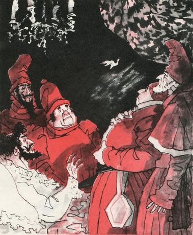 И не успела птичка взмахнуть своими маленькими крылышками, как её поймали, ощипали и запекли в большом пироге. Королевский пирог был очень велик, а птичка была такая маленькая, что его величество даже не заметил её и проглотил целиком. У короля внутри оказалось очень темно – гораздо темнее, чем бывает даже в полночь. Это очень не понравилось птичке, и она принялась клевать короля. Она клевала его без передышки. Король застонал так громко, что поднял на ноги весь дворец. Звеня шпорами, сбежались придворные, а король всё кричал и жаловался, что сегодняшний ужин пришёлся ему не по нутру. Учёные лекари в колпаках и длинных мантиях принесли королю лечебное зелье. Король выпил его, вздохнул, открыл рот, и птичка вылетела на свободу! Как зарница мелькнула она в воздухе и упала в родник, протекавший за королевским садом. Умывшись, птичка отправилась к столяру, выкупалась там в клею, а потом полетела в гости ко всем птицам леса. Каждой она рассказывала о том, что с ней случилось, просила каждую подарить ей одно только пёрышко. Птицы с радостью отдавали ей свои перья, и перья прилипали к птичке. Их было много, и все они были разные: красные, жёлтые, синие – одно ярче другого, и в своём новом пёстром платье серая птичка стала ещё нарядней, чем прежде. Она стала красивая, как ваза с фруктами на званом обеде. Теперь она могла снова лететь в дворцовый сад. Прилетев ко дворцу, она села на дереве перед королевским балконом и запела ещё громче, чем прежде: