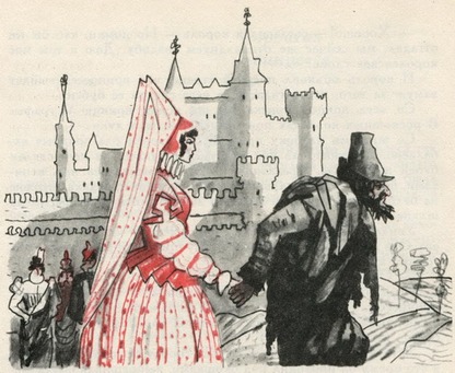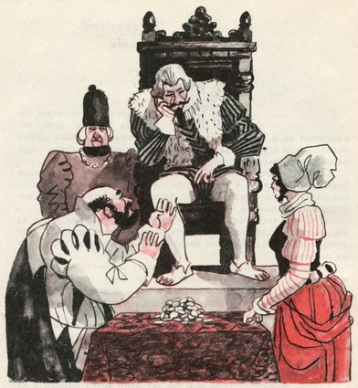Крестьянин жил в деревне, а король – в столице, в Мадриде. Деревня была далеко от Мадрида, и, конечно, король ничего не слыхал о крестьянине. Зато крестьянин знал многое про короля. Он знал, что король живёт в огромном дворце, что ест он самые лучшие кушанья, что подают ему их на золоте, что у него множество слуг и все его боятся – не только слуги, даже министры, разодетые в шёлк и бархат. «И конечно, этот король ростом с великана! – так думал крестьянин. – Не будь он таким высоченным и сильным, почему бы люди стали его бояться!» Одним словом, захотелось крестьянину на короля подивиться, посмотреть на него собственными глазами. Пришёл к жене и сказал: – Марианна, не пойти ли мне в столицу короля посмотреть? Что ты на это скажешь? – Я скажу тебе, что ты последний дурень и не дам денег на дорогу, – рассудительно отвечала жена. – У нас в доме всего три реала, к зиме надо купить и то и другое, а король обойдётся и без тебя! Вот досада! Видит крестьянин – не легко с женой сговориться. А сам думает: «Как бы не так! Ведь я не молод, а до сих пор короля не видал. Если сейчас не схожу в Мадрид, так и не придётся мне на короля поглядеть!» Делать нечего – пустился на хитрость. На другой же день снова пришёл к жене, стонет: – Жёнушка, зуб болит! К цирюльнику надо бежать: пусть вытащит! – И за щёку рукой держится. Жена знала, что частенько у мужа болят зубы. Поверила, пожалела: – Так в чём же дело? Ступай! – Да цирюльник-то в Мадриде живёт! – В Мадриде? А муж как повалится на пол, как закричит: – Ой, не могу терпеть, так больно. Перепугалась хозяйка: – Вот тебе три реала. Беги сейчас же, да скорей возвращайся обратно! Крестьянин схватил деньги – и за дверь. Идёт по дороге, радуется, песни поёт. Но мы знаем, что от деревни до столицы не близко. Три дня шёл крестьянин, за три дня чуть не все деньги проел: осталось всего-навсего полреала! Пришёл в Мадрид – на площади давка. Народ шумит, кони скачут – чуть с ног не сбили. – Что такое? – Король из церкви выходит! Протискался крестьянин поближе, видит: идут из дверей придворные, министры, советники, а вот и сам король! – Эвива! Живи много лет! – закричал народ. А крестьянин даже плюнул с досады: – Ну и король! Смотреть не на что! И вовсе не великан. Правда, золота на нём навешано много: на груди – золото, на плечах – золото, на шляпе, на рукавах – везде золото, а ростом такой, как все! Эка невидаль! – рассердился крестьянин. – Знал бы – не ломал ноги трое суток. Есть захотел. Пошёл на рынок. Сосчитал деньги – все карманы обшарил: полреала, и ни одним мораведи больше! А тут и на самом деле зуб разболелся. Остановился крестьянин против лавки пирожника, а продавец надрывается – во всё горло расхваливает свой товар:***