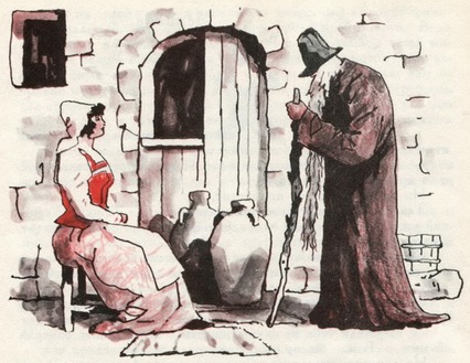 Крестьянин всю жизнь откладывал медные деньги на чёрный день. И вот пришла старость, крестьянин ослеп и не мог уже работать в поле, но не погиб от голода, потому что во дворе, возле дома, под высокой финиковой пальмой у него был зарыт большой кувшин из серой глины, до краёв наполненный медяками. Каждую субботу вечером, после захода солнца, слепой выходил во двор, разгребал руками землю и вынимал из заветного кувшина несколько медных монеток, чтобы прожить до следующей субботы. Прошёл год. Но крестьянин не унывал, так как у него всё ещё оставалось порядочно денег. И вдруг в одну из суббот слепой не нашёл кувшина на месте. Сколько ни шарил он руками под высокой финиковой пальмой, не мог ничего; нащупать: осталась в земле от кувшина только глубокая круглая ямка. Бедняга понял, что деньги у него украли. Но кто же мог это сделать? Наверное, кто-нибудь из соседей! Но соседей у крестьянина было двое – один справа, а другой слева. Справа жил бедняк, а слева- богач-торговец. Конечно, бедняк больше нуждался в деньгах! «И всё-таки, – подумал слепой, – никогда бедняк не позарится на гроши такого же, как и он, горемыки! Значит, деньги вырыл другой сосед». К тому же окно богача выходило как раз во двор слепого, и из него легко было подсмотреть, как крестьянин зарывал под деревом свои сбережения. «Чем больше человек богатеет, тем жаднее становится», – подумал слепой и постучался в дом богача. Конечно, он не сказал торгашу ни слова о своей пропаже. А начал так: – О сеньор сосед! Я очень болен и чувствую, что скоро умру. А у меня есть деньги – много денег. Я копил их всю свою жизнь и накопил целый кувшин медных монет. Этот кувшин из серой глины я закопал во дворе, под высокой финиковой пальмой. Что же будет с ним после моей смерти? Ведь нет у меня ни родных, ни друзей. Так вот, сеньор ваша милость, я решил оставить все мои денежки вам, потому что вы всегда были для меня добрым соседом. И я оставлю вам не только медные деньги. Нет, у меня есть ещё горшок с серебром. Он спрятан в другом месте. Но чтобы вы могли взять все мои деньги сразу, я завтра же закопаю горшок рядом с кувшином под высокой финиковой пальмой. Богач внимательно выслушал его и долго благодарил. Когда же крестьянин ушёл, взял заступ, потихоньку пробрался во двор слепого и закопал кувшин с медяками на прежнем месте. «Теперь мне достанутся не только медные деньги, но и горшок с серебром!» – радовался богач. Но радовался напрасно, потому что слепой на другой же день выкопал свой кувшин из серой глины и спрятал его в надёжном месте. А вечером снова постучался в дом богача и объявил ему, громко плача: – Сеньор ваша милость! У меня всё украли! И горшок, и кувшин – все мои сбережения! Всё до последнего сентаву! Идёмте скорее ко мне во двор! Он привёл богача к высокой финиковой пальме, и тот убедился, что под деревом нет ни горшка, ни кувшина. Богач понял, что слепой перехитрил его, но как быть? Не тащить же слепого к судье за то только, что взял он назад свои собственные медные деньги!ЛЕНИВАЯ ЖЕНА