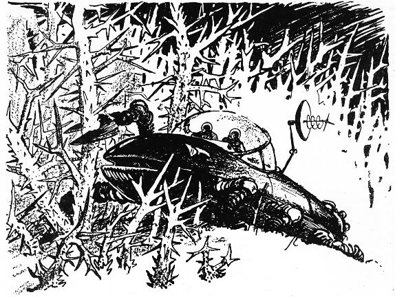 «Черепаха» зашевелила лапами с толстенными подушками присосов. В отличие от обычной черепахи она была шестиногой. Едва она пришла в движение, как позади корпуса забили три мощных воздушных струи, и черепаха довольно быстро двинулась по болотистому грунту. Длинный залив преградил ей путь. Она плюхнулась в воду и, не сбавляя хода, поплыла. В кормовой части вместо воздухометов теперь заработали водометы. Едва выбравшись на берег, путешественники натолкнулись на густые заросли. Растения переплетались, словно гигантские проволочные заграждения, у которых «проволока» была толщиной в руку, а «колья» — в два-три обхвата. Местами они стояли густо, как забор, местами пересекали растительную паутину под всевозможными углами. Колючки самого разного размера, от штопальной иглы до штыка, торчали во все стороны. Люди в кабине невольно поежились. — Двигайтесь напрямик, — послышался голос Горина в шлемофонах. — Полоса зарослей не широка. — Попробуем ножницы? — предложил Гарги. Карбышев кивнул. — Сбавь ход, — попросил индиец. Черепаха теперь ковыляла на своих лапах с неуклюжестью настоящего животного. Гарги надел перчатки управления ножницами. Он протянул руку вперед, и, повторяя его движение, черепаха выдвинула огромную клешню с массивными двухметровыми кусачками на конце. Гарги сделал движение пальцами, и ножницы перекусили ствол, словно прут. Левая клешня, с зубчатой поверхностью, подчиняясь движениям левой руки Гарги, схватила откушенную часть ствола и бросила в сторону. Черепаха медленно протискивалась в выстригаемый ход. — Вижу ракету, — раздался взволнованный голос Горина. — Она затонула. Из воды торчит хвост. Я один ничего не могу сделать. Спешите! Легко сказать: спешите! Древесные культяпки от состриженных стволов визжали, царапая борта. Наконец черепаха уткнулась в безнадежно спутанный клубок зарослей. — Дайте я, — нетерпеливо сказал Нгарроба.