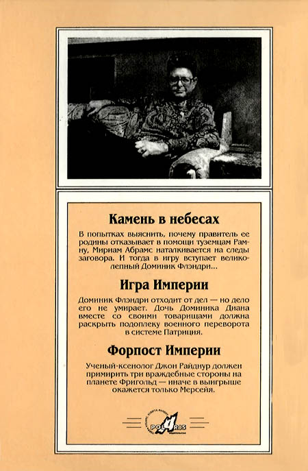 В этот том собрания сочинений выдающегося фантаста Пола Андерсона вошли романы, завершающие цикл произведений о главном агенте Терранской Империи Доминике Флэндри, — «Камень в небесах» (1979) и «Игра Империи» (1985), а также повесть «Форпост Империи» (1968). По мере того как близится к концу сериал о Терранской Империи, общий тон его становится все пессимистичнее. В первом из романов Флэндри — адмирал, один из высших сановников Империи — с тоской смотрит, как рычаги влияния ускользают из его рук, а с ними и возможность изменять ход событий. Скудоумного и подлого императора Герхарта заботит не благосостояние Империи, а личная власть. Флэндри, живое напоминание об отце — военном гении, ему не нужен. И однако Флэндри не бессилен. Он еще способен рисковать. С помощью верного слуги Чайвза и дочери своего первого командира Макса Абрамса он разрушает коварные планы герцога Гермесского узурпировать императорский трон. Но процесс распада уже не остановить. Гермес теряет свое влияние в Галактике, и после поражения заговора ему уже не подняться. А Флэндри преодолевает старую душевную боль и вместе с Бэннер Абрамс входит в осень… Во втором романе — «Игра Империи» — Флэндри почти не появляется. Но мир, где происходит действие, создан его трудами. Аборигены погибшего во вспышке сверхновой Старкада стараниями юного Флэндри переселены на непригодную для людей, но вполне подходящую для обеих разумных рас — «водяных» и «тигранов» — планету Имхотеп. Но годы летят. И вот уже незаконнорожденной дочери Флэндри, всю жизнь прожившей на Имхотепе, вместе с ее другом-тиграном предстоит раскрыть очередной военный заговор на соседней планете — Дедале, организованный давними врагами Империи — мерсейцами, которые способны создать и воплотить в жизнь хитроумный план даже без помощи побежденного Домиником Флэндри Айхарайха… А повесть «Форпост Империи» возвращает нас к другому бывшему командиру Флэндри — Джону Райднуру. Посланный на задворки Империи ксенолог должен совершить невозможное — остановить, с одной стороны, гражданскую войну на колонии Фригольд, а с другой — близящееся полномасштабное вторжение арулиан, странной птицеподобной расы, чей родной мир давно находится под властью Мерсейского Ройдхуната. И это удается ему, хоть и не без труда.Камень в небесах