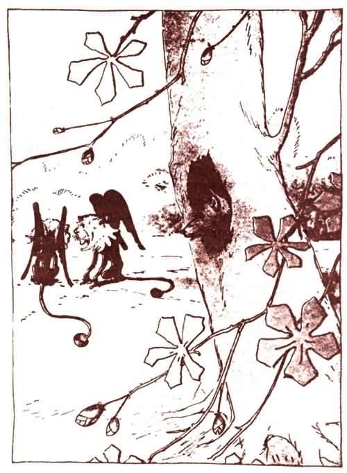 Короля Гномов так разгневал отказ, что он стал описывать вокруг Кики Ару круги, взлетая высоко в воздух, не в силах сдержать свое бешенство. Наконец ему удалось взять себя в руки. Но Кики Ару и глазом не моргнул. Он только смеялся ужимкам и прыжкам Гнома, отчего тот еще больше рассердился.