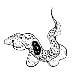 В представлении многих людей амеба — самое примитивное животное. Она состоит всего из одной клетки, не имеет рта, у нее нет скелета, нет даже постоянной формы тела. Однако это одноклеточное животное — удивительное существо. Присмотримся же к амебе более внимательно. Прежде всего, условимся, что мы будем говорить не об амебе вообще, а об амебе обыкновенной. На научном языке ее называют амеба протей в честь мифологического персонажа Протея. Сын бога Посейдона (Нептуна), Протей, отождествлялся у древних греков с такими понятиями, как непостоянство и переменчивость. В различных мифах Протей принимает самые необычные образы: старика, льва, змеи, кабана, быка, огня, воды, дерева. Видимо, отсутствие постоянной формы тела у амебы и стало причиной сравнения ее с Протеем. Амеба протей обитает в неглубоких пресноводных водоемах со стоячей или медленно текущей водой. Амебы передвигаются по дну или по лежащим на дне предметам и питаются живущими в воде бактериями. Тем не менее загрязненные гниющими веществами водоемы для протея губительны. Этот вид обитает только в чистых или очень слабо загрязненных водах. От других амеб, живущих в наших пресноводных водоемах, протей отличается тем, что в активном состоянии образует одновременно до десяти широких округлых ложноножек, в то время как у других видов рода Амеба имеется либо всего одна широкая ложноножка, либо ложноножки тонкие и заостренные. Ложноножки все время находятся в движении, исчезают и появляются вновь, меняют свою форму. Можно сказать, что большая часть тела протея находится именно в ложноножках. Тело амебы протея состоит только из одной клетки, но клетка эта достаточно большая. Протей достигает размера 0,2–0,5 мм и считается крупным видом своего рода. На микроскопическом препарате искусственно окрашенную амебу протея видно даже невооруженным глазом. Отсутствие постоянной формы тела является причиной того, что у амебы нет ни переднего, ни заднего конца тела. Более того, у этого простейшего отсутствует постоянное место «рта» и место удаления непереваренных остатков пищи. Встречаясь с твердыми пищевыми частицами (например, с бактериями), голодная амеба просто захватывает их своим телом-клеткой. При этом та часть наружной мембраны, которая соприкасается с бактерией, начинает впячиваться, образуется углубление и бактерия постепенно втягивается внутрь клетки. Когда определенное количество бактерий окажется полностью погруженным в клетку, мембрана замыкается. Образуется крошечный пузырек с бактериями внутри — пищеварительная вакуоль. С момента образования этой вакуоли начинается процесс пищеварения. Из цитоплазмы --">- 1