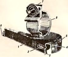 Рис. 32. Прицельное приспособление гранатомета: 1 — качающаяся часть; 2 — уровень; 3 — прорезь (целик); 4 — прицельная шкала; 5 — указатель деления прицела; 6 — пружинная обойма (неподвижная часть); 7 — зажим; 8 — мушка.