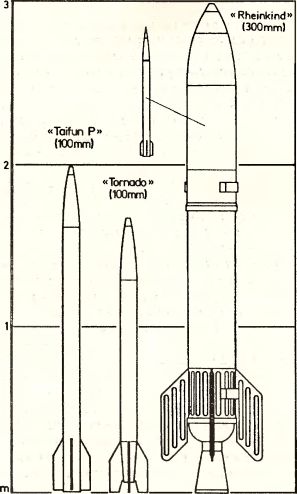 Рис. 189. Неуправляемые оперативно-тактические ракеты (слева «Rheinbote», справа проект трехступенчатой ракеты).