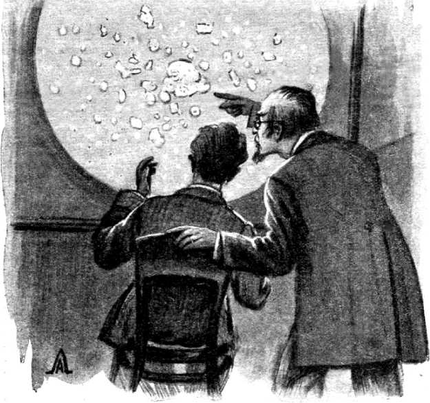 Свенсон взял меня за руку. — Довольно, теперь пойдем дальше… Если бы не чересчур высокий потолок да не огромный, во всю стену, металлический экран, то просторная зала, в которую мы вошли, не представляла бы собой ничего особенного. Впрочем, внимательно осмотревшись, можно было в стене, напротив экрана, заметить небольшое круглое отверстие, на высоте приблизительнодвух с половиной метров от пола, да несколько небольших рычажков чуть пониже. Это — все, что я успел увидеть. Свенсон предложил мне сесть в стоявшее в сторонке кресло и, попросив обождать, побежал к рычажкам. Что он там делал, я не видел. Наконец, он обернулся и поднял руку: — Внимание! Я насторожился. Свет погас. Наступила напряженная тишина. Но вот откуда-то донеслось еле слышное жужжание, будто над головой закружил москит, и вдруг из отверстия брызнул сноп лучей. Экран засветился невообразимо красивым голубым светом, на фоне которого медленно вырисовывался большой, пористый, бесформенный кусок. — Это пылинка, которую ты смотрел недавно! — пояснил неслышно подошедший сзади Свенсон. Я не мог удержаться от возгласа удивления — такого увеличения я не представлял себе, — но сейчас же, с удвоенным вниманием, впился взглядом в экран. Кусок медленно расплывался… Уже нельзя было назвать его цельным — вместо него появилось несметное количество отдельных туманных пятен, медленно двигавшихся в разных направлениях.