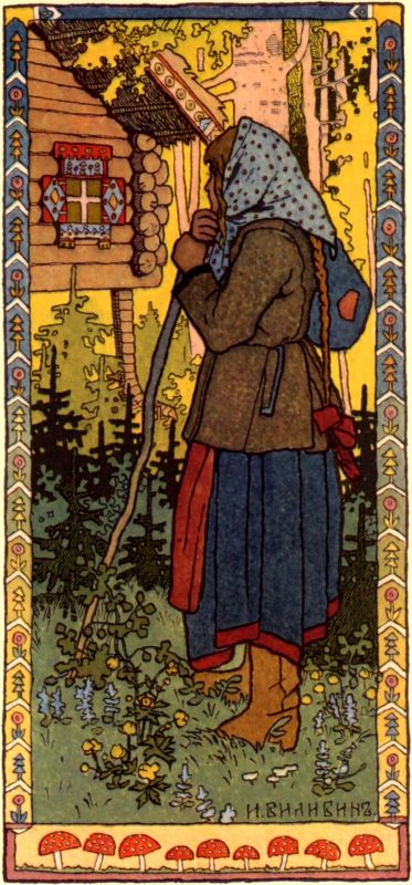Долго ли, коротко ли шла. Лес стал чернее и гуще, верхушками в небо упирается. Башмаки железные истоптала, посох чугунный источила, каменный хлеб изглодала. Вышла на полянку. Вдруг видит — стоит перед ней избушка на курьих ножках, туда-сюда поворачивается.