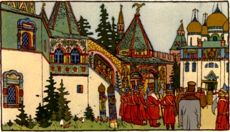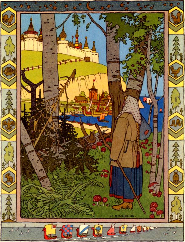 А лес все реже и реже. Вот и сине море — широкое и раздольное — разлилось перед нею, а там, вдали, как жар, горят золотые маковки на высоких теремах белокаменных.