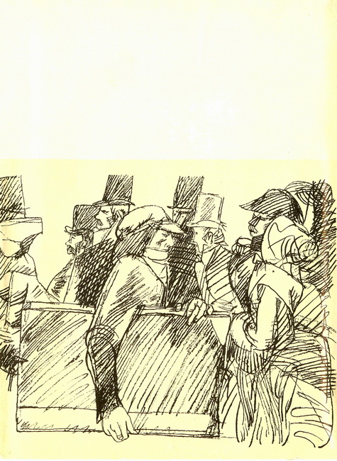 «Шинель» Худ. КукрыниксыВошедши в залу, Чартков нашел уже целую огромную толпу посетителей, собравшихся перед картиною. Глубочайшее безмолвие, какое редко бывает между многолюдными ценителями, на этот раз царствовало всюду. Он поспешил принять значительную физиономию знатока и приблизился к картине; но, боже, что он увидел! Чистое, непорочное, прекрасное, как невеста, стояло пред ним произведение художника. Скромно, божественно, невинно и просто, как гений, возносилось оно над всем. Казалось, небесные фигуры, изумленные столькими устремленными на них взорами, стыдливо опустили прекрасные ресницы. С чувством невольного изумления созерцали знатоки новую, невиданную кисть. Все тут, казалось, соединилось вместе: изученье Рафаэля, отраженное в высоком благородстве положений, изучение Корреджия, дышавшее в окончательном совершенстве кисти. Но властительней всего видна была сила созданья, уже заключенная в душе самого художника. Последний предмет в картине был им проникнут; во всем постигнут закон и внутренняя сила. Везде уловлена была эта плывучая округлость линий, заключенная в природе, которую видит только один глаз художника-создателя и которая выходит углами у копииста. Видно было, как все извлеченное из внешнего мира художник заключил сперва себе в душу и уже оттуда, из душевного родника, устремил его одной согласной, торжественной песнью. И стало ясно даже непосвященным, какая неизмеримая пропасть существует между созданьем и простой копией с природы. Почти невозможно было выразить той необыкновенной тишины, которою невольно были объяты все, вперившие глаза на картину, — ни шелеста, ни звука; а картина между тем ежеминутно казалась выше и выше; светлей и чудесней отделялась от всего и вся превратилась наконец в один миг, плод налетевшей с небес на художника мысли, миг, к которому вся жизнь человеческая есть одно только приготовление. Невольные слезы готовы были покатиться по лицам посетителей, окруживших картину. Казалось, все вкусы, все дерзкие, неправильные уклонения вкуса слились в какой-то безмолвный гимн божественному произведению. Неподвижно, с отверстым ртом стоял Чартков перед картиною, и наконец, когда мало-помалу посетители и знатоки зашумели и начали рассуждать о достоинстве произведения и когда наконец обратились к нему с просьбою объявить свои мысли, он пришел в себя; хотел принять равнодушный, обыкновенный вид, хотел сказать обыкновенное, пошлое суждение зачерствелых художников, вроде следующего: «Да, конечно, правда, нельзя отнять таланта от художника; есть кое-что; видно, что хотел он выразить что-то; однако же, что касается до главного…» И вслед за этим прибавить, разумеется, такие похвалы, от которых бы не поздоровилось никакому художнику. Хотел это сделать, но речь умерла на устах его, слезы и рыдания нестройно вырвались в ответ, и он как безумный выбежал из залы. С минуту, неподвижный и бесчувственный, стоял он посреди своей великолепной мастерской. Весь состав, вся жизнь его была разбужена в одно мгновение, как будто молодость возвратилась к нему, как будто потухшие искры таланта вспыхнули снова. С очей его вдруг слетела повязка. Боже! и погубить так безжалостно лучшие годы своей юности; истребить, погасить искру огня, может быть, теплившегося в груди, может быть, развившегося бы теперь в величии и крас