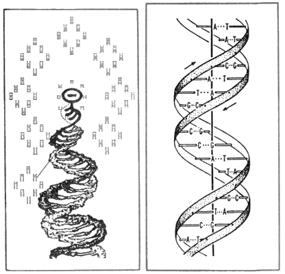 «Некитайская» часть истории «И цзина» началась с факта, весьма далекого от востоковедения и тем более столь специфического его раздела, как исследование древних текстов. В 1962 г. ученые Дж. Уотсон и Ф. Крик получают Нобелевскую премию за открытие ДНК — дезоксирибонуклеиновой кислоты, сделанное ими в 1953 г. Эти же ученые представляют научному миру структурную схему ДНК, молекулу которой упрощенно можно вообразить в виде двойной спирали. Две цепи спирали соединены между собой водородными связями, образуя так называемые комплементарные или дополнительные половины, соотносящиеся друг с другом как позитив и негатив — прямая аналогия с противоположными началами китайской философии инь и ян. Именно в ДНК заложена способность организмов к самовоспроизводству, которая основана на репликации нуклеиновых кислот. Труды Дж. Уотсона и Ф. Крика, и вместе с ними рентгеноструктурные исследования М. Уилкинса раскрыли структуру ДНК. Она представляет собой длинную цепь повторяющихся последовательностей: сахар — фосфат — сахар — фосфат и т. д. Существуют четыре базовых элемента или основания: тимин (Т), аденин (А), цитозин (Ц) и гуанин (Г). В двойной спиральной структуре ДНК они пересекаются между собой, вступают в бинарную, т. е. двойную связь, причем каждый элемент имеет свою, жестко установленную пару. Так аденин всегда парен тимину, цитозин — гуанину, гуанин — цитозину, тимин — аденину. Таким образом, любая наследственная информация записана языком, содержащим лишь четыре буквы. Напомним, что молекула ДНК — не плоскостная, но объемная структура, чем-то напоминающая спирально закрученную ленту. В сущности, существуют как бы две «ленты» (принцип «двойной спирали»), идущие параллельно и скрепленные между собой, как мостиками, связями между четырьмя базовыми элементами. Нередко структуру молекулы ДНК несколько ненаучно, но весьма точно сравнивают с застежкой-молнией, зубцы которой и есть четыре базовых элемента. Во время репликации ДНК каждая из двух цепей спирали воспроизводится, достраивая себе «двойника», и таким образом структура, а следовательно, и информация, содержащаяся в новой молекуле, точным образом соответствует родительской или исходной молекуле. Конечно, то что мы изложили здесь — весьма примитивное и неполное описание предельно сложной структуры, до конца не изученной и по сей день. Но для популярного изложения и наших дальнейших рассуждений этого вполне достаточно. Итак, по существу, «И цзин» представляет собой весьма странный, но достаточно емкий способ передачи информации. Не будем исключать и следующего: то, что для нас может показаться слишком «символичным» и близким к чудовищной головоломке, для составителей «И цзина», для тех, кто использовал его фигуры, было доступно и понятно, они считывали информацию так же легко, как мы читаем обычную книгу. Кстати, можно привести и прямые аналоги подобных запутанных кодов, например, машинные коды, которыми оперирует внутри себя любой компьютер. Фактически это ряд абсолютно непонятных для непосвященного чисел, соответствующих сложнейшим операциям приема и передачи информации по внутренним сетям ЭВМ. Но для простого пользователя компьютер преобразовывает «свой» язык во вполне понятные нам слова или изображения.Причем пользователь компьютера даже и не знает, на каком сложнейш