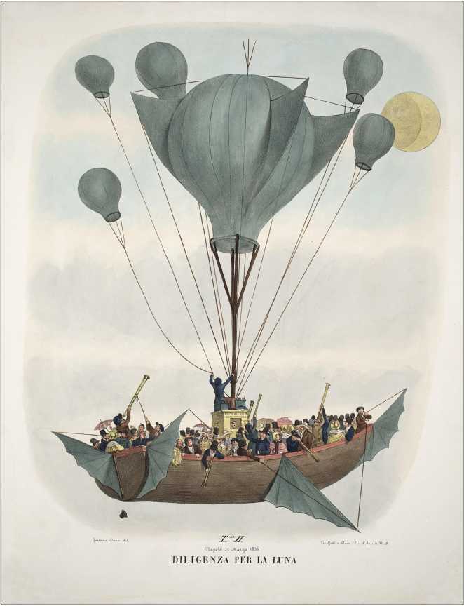 Гаэтано Дура. «Дилижанс на Луну». Литография. Неаполь, 1836.