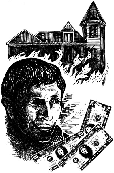 День начался как всегда. Как раз подошло время снова выставлять шкуры на солнце, поэтому после завтрака папа с дядей Сагамором привезли на грузовике корыта и сгрузили их у самого дома. Все кожи уже давно распались на части, и вонь стояла — хуже некуда. Ветра не было, так что запах обволакивал весь дом и висел стеной, просто ужас. А в корытах все клокотало и бурлило, поверхность затянулась густой зелено-коричневой пеной. У меня аж слезы на глаза выступили, и я поспешил убраться подальше, поглядеть, как дела у дяди Финли. У него опять вышел весь запас досок, поэтому он занимался тем, что отдирал их с одного места и переколачивал на другое — дыры латал, как называл это дядя Сагамор. Дядя Финли все бормотал что-то себе под нос, а со мной и вовсе не разговаривал, так что вскорости я смотался оттуда и пошел к голубому трейлеру поглядеть, чем там занимается мисс Харрингтон. Они с доктором Северансом, по своему обыкновению, сидели в креслах и слушали по радио утренние новости. Доктор лишь кивнул, завидев меня, а мисс Харрингтон вынесла из трейлера кока-колы. Сегодня она была одета в беленький костюмчик и выглядела — просто закачаешься. — Хочешь поплавать сегодня вечером, Билли? — Мне бы, само собой, страсть как хотелось бы, — говорю я. — Боюсь только, папа опять мне задаст. — Скажи ему, пусть дурью не мается, — хмыкнула мисс Харрингтон. — Заходи, за мной часиков в пять, и все равно пойдем. Доктор Северанс сердито посмотрел на нее и выключил радио. — Что я тебе сказал, не уходи далеко от трейлера. Рано чувствовать себя в безопасности. — Перестань ворчать, зануда, — огрызнулась она. — Прошло уже десять дней. Тут я поглядел вниз по склону и увидел папу, который лежал под машиной перед самым домом, как будто что-то чинил. — Зайду за вами в пять часов, — пообещал я мисс Харрингтон и вместе с Зигом Фридом помчался посмотреть, чего это он там делает. Не успел я подойти, как папа выпрямился, и я заметил, что в руках у него какая-то жестяная банка. Наверное, отлил немного бензина из бензобака. Он скрылся за углом дома, а на смену ему из конюшни явился дядя Сагамор с четырьмя стеклянными кувшинами. Чудно, право, что им вздумалось наливать бензин в стеклянные кувшины. И потом, зачем им понадобилось четыре таких здоровенных кувшина, чтобы вылить содержимое всего одной малюсенькой банки? Когда я проходил мимо корыт с кожами, пришлось зажать нос, но я ускорил шаг и тоже завернул за угол. Интересно было поглядеть, что же они делают. На заднем дворе, в тени сиреневых кустов, стоял небольшой стол. Дядя Сагамор поставил на него свои четыре кувшина, а папа тем временем макал в жестянку кусок белой бечевки. Когда она как следует промокла, он обвязал ее вокруг одного из кувшинов, а дядя Сагамор поднес к ней горящую спичку. А она как полыхнет! Вокруг кувшина на минуту образовалось кольцо пламени. Потом папа с дядей взяли следующий обрывок бечевки и проделали то же самое со вторым кувшином. Я смотрел на них во все глаза — до того бессмысленным и забавным мне все это казалось. Папа с дядей Сагамором не успокоились, пока не проделали эту странную процедуру со всеми четырьмя кувшинами, после чего сняли обгоревшие остатки бечевки и тщательно протерли кувшины тряпочкой. Я подошел к ним. — Эй, па, — спросил я, — а что это вы делаете? Они оба так и подпрыгнули и уставились сперва на меня, а пото