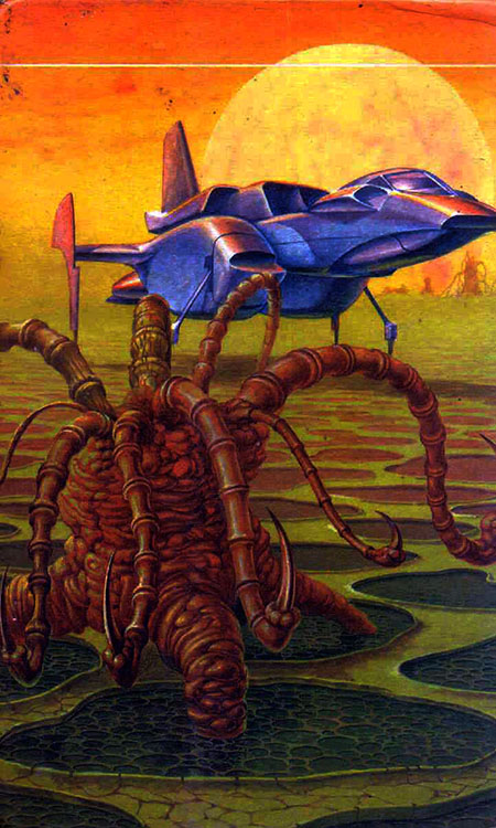 Путешествие через джунгли к разбившемуся звездному кораблю оказалось гораздо легче, чем первоначальный путь от места падения до Миссии. На сей раз темно-красная растительность, извиваясь, расступалась перед ними, образуя широкую тропу для Муна, сестры Марион и полудюжины прокаженных, взятых для подсобных работ. С неба сыпал нескончаемый дождь, серые балахоны прокаженных промокли насквозь, а пурпурные ленты сестры Марион прилипли к ее шляпе. Беспрерывно моросивший теплый дождик ничуть не беспокоил Муна, но ему хватало ума помалкивать об этом. Вместо этого он связался с Красным Мозгом, и широкие листья пурпурных пальм развернулись над тропой, частично прикрыв идущих от дождя. Размокшая почва хлюпала под сапогами, в которые уже успела набраться дождевая вода. Шли молча, да и что тут можно было сказать? Не будь эта экспедиция предпринята по личной "просьбе самого Охотника за Смертью, ради которого прокаженные были готовы на все, они, пожалуй, повернули бы назад, невзирая на Муна и сестру Марион. Сам Оуэн остался в Миссии. Он хотел встретить курьерский корабль на посадочной площадке. Сестра Марион поскользнулась на слякотной тропе. Мун поддержал ее, но, получив в благодарность свирепый взгляд, мигом отдернул руку. Монахиня в сотый раз вынула из прохудившегося рукава драный носовой платок и утерла мокрое лицо. — Терпеть не могу джунгли, — проворчала она. — Стволы у деревьев черные, как головешки, а листья и трава красные, ровно кровавые потроха. Не говоря уже о вонище! — Опавшая листва, перегнивая, удобряет почву и дает новую жизнь, — заметил Мун. Сестра Марион фыркнула: — Ага. «Даже самая дивная роза корнями растет из навоза». Знаю, все я знаю. Дождь, вонища и джунгли, с виду смахивающие на скотобойню. Не удивительно, что сюда приперлись именно мы: черта с два удалось бы найти других таких дураков. — Мы почти подошли к месту аварии, — примирительно сказал Мун. — Теперь уже совсем близко. — А я тебя об этом спрашивала? — рявкнула сестра Марион. — Я подумал, может быть, тебе интересно, — спокойно отозвался Мун. — Это на прогалине, прямо перед нами. — Ненавижу дождь, — пробурчала монахиня, глядя на землю. — Никогда его не любила. Наконец они вышли на поляну. Когда все подтянулись и огляделись, растерянные и сердитые взгляды прокаженных обратились к Муну. Проплешина, поросшая алой и багровой травой, решительно ничем не отличалась от множества других, попавшихся им по дороге: никаких признаков разбившегося звездного корабля на ней не было. Сестра Марион медленно повернулась к Муну. Вид ее не сулил ничего хорошего. — Если ты хотя бы заикнешься насчет того, что сбился с пути, я дам тебе такого пинка по заднице, что все твое дерьмо выскочит через уши. Что, кстати, пойдет на благо твоей душе, если таковая у тебя имеется. — Не стоит горячиться, — невозмутимо отозвался Мун. — Место то самое, мы не заблудились. А корабля не видно потому, что все обломки поглотили джунгли. — Будем надеяться, что еще не переварили, — буркнула монахиня. Неожиданно она пошатнулась, непроизвольно потянулась рукой к голове, но усилием воли заставила себя остановиться. Затянутая в перчатку рука сильно дрожала, но все сделали вид, будто ничего не заметили. — Так сразу корабль не откопаешь, на это потребуется время, — осторожно промолвил Мун. — Почему бы тебе, сестра, не найти тут