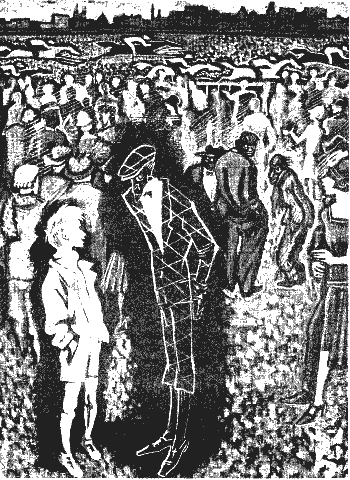 — Нет, есть. Пять марок, — сказал незнакомец. И, словно между прочим, добавил: — Я случайно видел, как ты нашел монету. Если ты собираешься ставить на какую-нибудь лошадь, бери-ка вот эту квитанцию. Я ее уже заполнил. Верный выигрыш! Тим слушал его, то краснея, то бледнея, потом понемногу пришел в себя, и лицо его снова приняло свой обычный смуглый оттенок. (Цвет лица он унаследовал от матери.) — Детям ведь, кажется, не разрешается играть на скачках, — проговорил он наконец и снова запнулся. Но незнакомец не отставал. — Этот ипподром, — заявил он, — один из немногих, где не так уж строго придерживаются этого правила. Не то чтобы это разрешалось официально, но здесь на это смотрят сквозь пальцы. Так что же ты думаешь о моем предложении, Тим? — Я вас совсем не знаю, — тихо ответил Тим. Только сейчас он заметил, что господин этот называет его по имени. — Зато я о тебе много чего знаю, — заявил незнакомец. — Ведь я встречался с твоим отцом. Это решило дело. Правда, у Тима как-то плохо укладывалось в голове, что отец его водил знакомство с таким странным, хорошо одетым господином; но раз незнакомец знает, как зовут Тима, значит, уж каким-то образом он был знаком с его отцом. Постояв еще немного в нерешительности, Тим взял заполненную квитанцию и, достав из кармана свою монету, пошел к кассе. В этот момент громкоговоритель объявил, что начинается второй заезд. Незнакомец крикнул: — Давай скорее, пока не закрыли окошка! Вот увидишь, я принесу тебе счастье! Тим протянул кассирше деньги и квитанцию, взял отрывной талончик и обернулся, ища глазами господина в клетчатом. Но тот уже исчез. Второй заезд кончился, и лошадь, на которую поставил Тим, пришла к финишу первой, на три корпуса обойдя другую. Тим получил в окошке свой выигрыш: такой кучи ассигнаций он никогда еще не видел. И опять то краснея, то бледнея, только на этот раз от радости и гордости, стоял Тим у кассы и с сияющими от счастья глазами показывал всем любопытным выигранные деньги. Радость и горе всегда живут рядом. На Тима вдруг снова нахлынули воспоминания об отце, которого сегодня похоронили: никогда он не выигрывал столько денег! Слезы сами потекли по лицу Тима, и он расплакался у всех на глазах. — Э, парень, кому привалило такое счастье, тому уж хныкать не след, — раздался вдруг у него над ухом скрипучий гортанный голос. Тим увидел сквозь слезы человека в помятом костюме и с помятым лицом. Слева от него какой-то рыжий верзила с высоты своего роста внимательно разглядывал Тима. Справа стоял низенький, лысый, элегантно одетый господин; он смотрел на Тима с живым участием. Все трое, казалось, держались вместе; во всяком случае, они в один голос спросили, не хочет ли Тим выпить вместе с ними лимонаду, чтобы отпраздновать выигрыш. Тим, пораженный такой доброжелательностью не меньше, чем счастьем, неожиданно выпавшим на его долю, кивнул в знак согласия и, всхлипнув еще разок, сказал: — Я хотел бы посидеть за столиком вон там, в саду. Сколько раз он сидел здесь с отцом и пил лимонад! — Хорошо, малыш, в саду так в саду, — опять сказали в один голос все трое. И через минуту они уже сидели вместе с Тимом за столиком в тени большого каштана. Господин в клетчатом, который принес Тиму счастье, больше не появлялся, и вскоре Тим совсем позабыл о нем, тем более что трое новых приятелей, заказав себе пива, а мальчику — лимонаду,