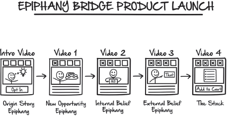 В книге DotComSecrets я также поделился нашими воронками запуска продуктов, а также сценариями, которые мы успешно использовали в прошлом в рамках воронки запуска продуктов. Но я знал, что сообщения и истории в наших вебинарах работают очень хорошо, так почему бы не использовать их снова здесь? Таким образом, мы просто воссоздали истории "Идеального вебинара" и "Моста прозрения" в структуре воронки запуска продукта.