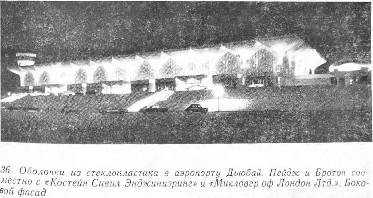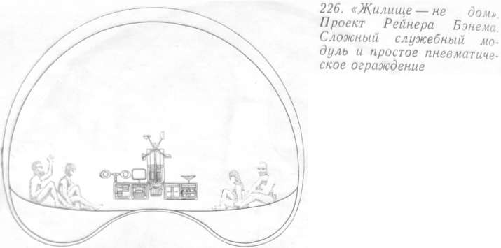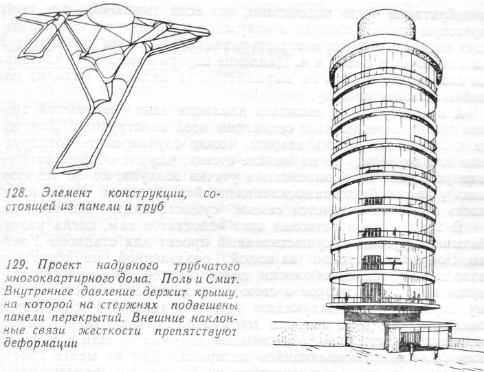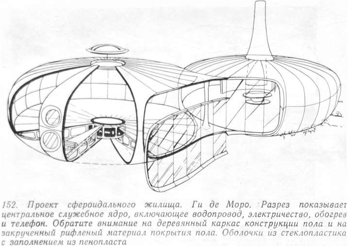 Во-первых, архитектор привык проектировать в границах свойств традиционных строительных материалов, поэтому, когда эти ограничения снимаются, появляются непредусмотренные трудности. Все это напоминает различие между традиционным джазом с его жестким строем, дающим музыканту возможность импровизировать, и определенными видами современного джаза. где жесткий строй отсутствует, музыкант поставлен перед задачей создать что-то «из ничего». Или же, возвращаясь к строительной терминологии, — это напоминает различие между проектированием здания на трудном участке, где сами трудности подсказывают решение, и проектированием на плоском, лишенном характерных особенностей участке, где все зависит от фантазии проектировщика. Во-вторых, поскольку с помощью полимерных материалов осуществима любая идея архитектора, их применяют, особенно в теоретических проектах все еще в качестве панацеи — лекарства от всех болезней.