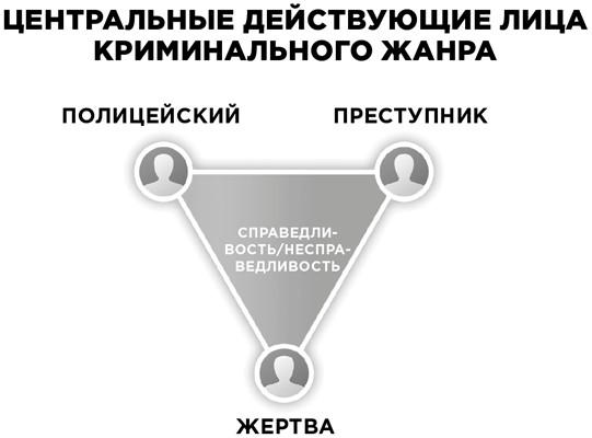 ЦЕНТРАЛЬНАЯ ЦЕННОСТЬ: СПРАВЕДЛИВОСТЬ/НЕСПРАВЕДЛИВОСТЬ. ЦЕНТРАЛЬНЫЕ ДЕЙСТВУЮЩИЕ ЛИЦА: ПОЛИЦЕЙСКИЙ, ПРЕСТУПНИК, ЖЕРТВА. ЦЕНТРАЛЬНОЕ СОБЫТИЕ: РАЗОБЛАЧЕНИЕ ПРЕСТУПНИКА. ЦЕНТРАЛЬНАЯ ЭМОЦИЯ: НАПРЯЖЕННОЕ ОЖИДАНИЕ (САСПЕНС). За последние два столетия главный герой криминального жанра превратился из находчивого, хладнокровного сыщика с железобетонными моральными принципами в психологически и эмоционально сложную личность с гибкой этикой. (См. сериал «Мейр из Исттауна», Mare of Easttown.)
