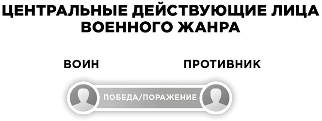 ЦЕНТРАЛЬНАЯ ЦЕННОСТЬ: ПОБЕДА/ПОРАЖЕНИЕ. ЦЕНТРАЛЬНЫЕ ДЕЙСТВУЮЩИЕ ЛИЦА: ВОИН, ПРОТИВНИК. ЦЕНТРАЛЬНОЕ СОБЫТИЕ: РЕШАЮЩАЯ БИТВА. ЦЕНТРАЛЬНАЯ ЭМОЦИЯ: ЖИВОТНЫЙ СТРАХ. Успех военной стратегии зависит от мужества, которого должно хватить, чтобы претворить эту стратегию в жизнь. Военный жанр требует персонажей, которые действуют наперекор страху. (См. «Ярость», Fury.)3. Эпический жанр