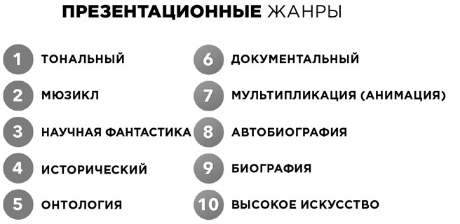 Итак, первичный жанр выбран, произведение начинает формироваться, теперь необходимо подарить событиям голос. В презентационных жанрах выбор лежит в плоскости средств выражения: какой формат лучше подойдет для данной истории — экран, книга, сцена? В каком сеттинге она будет происходить? Какая стилистика будет оптимально сочетаться с визуальными и звуковыми образами? Сколько должно длиться повествование? В каком темпе? В каком времени — настоящем, прошлом, будущем? Перед нами десять вариантов презентационного выбора. Экшен может предстать в обличье любого из них, даже мюзикла.