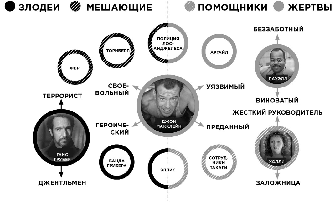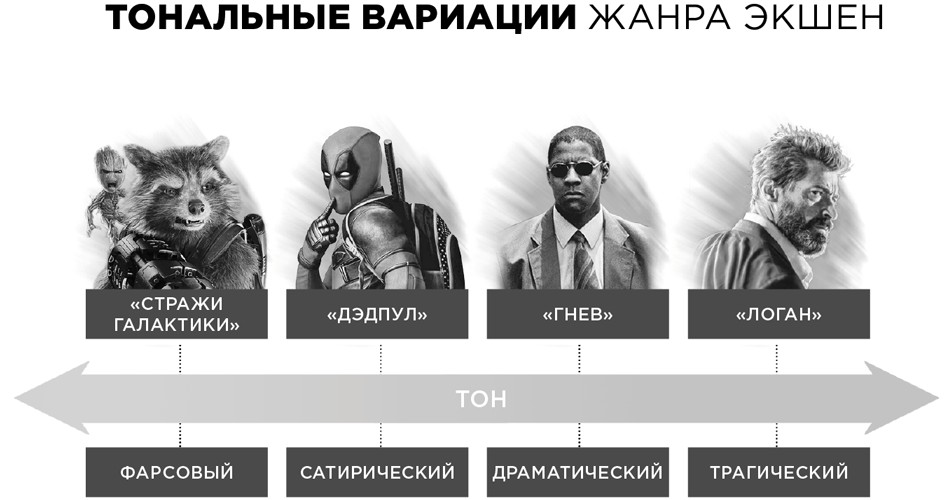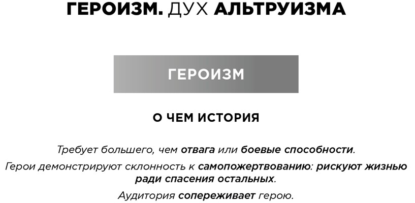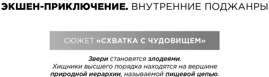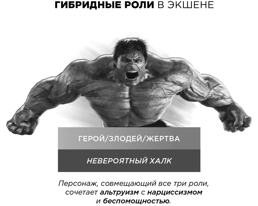 Центральные действующие лица экшена образуют треугольник нравственных архетипов. Неотъемлемое качество героя — альтруизм, злодея — нарциссизм, жертвы — уязвимость. Каждый из перечисленных десяти жанров включает в себя поджанры: у криминального, например, их четырнадцать; у любовного — шесть, у экшена — четыре. Поджанры экшена и шестнадцать их внутренних поджанров мы рассмотрим в части 4.