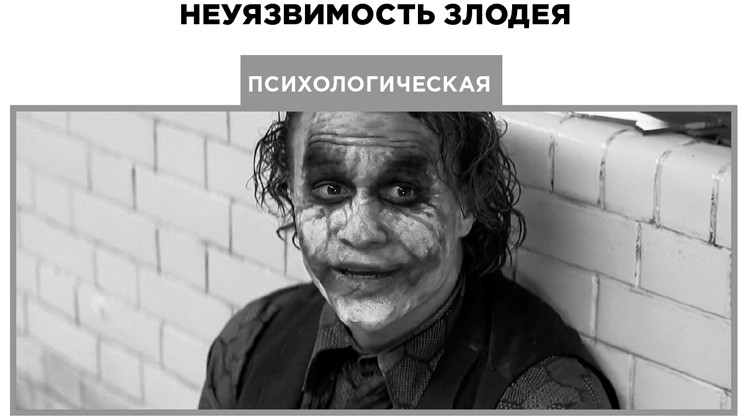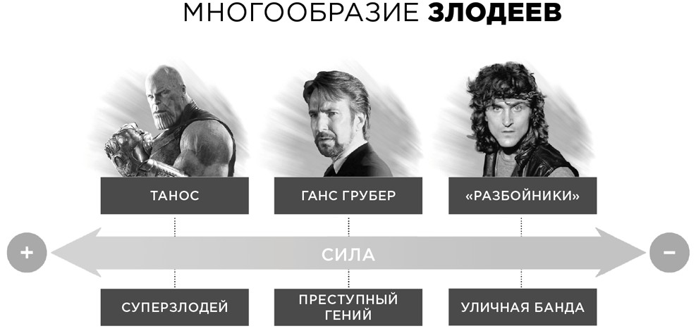 Злодеи бывают разными: от суперзлодеев до криминальных талантов и далее до уличных банд. Они без колебаний прибегают к насилию, поскольку не видят в жертвах людей. Герой же, в отличие от них, прибегает к насилию лишь вынужденно, поскольку видит человеческое во всех, в том числе в злодее. Для злодея герои и жертвы лишь неодушевленные объекты, средства достижения цели. Для героя никто, даже злодей, неодушевленным объектом не является.