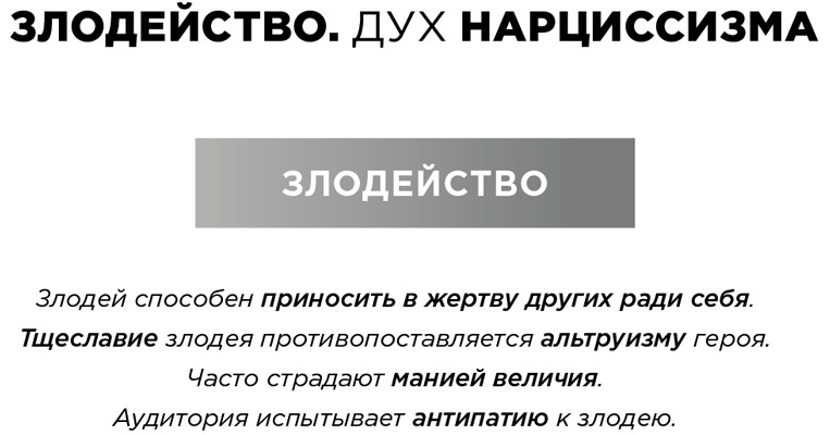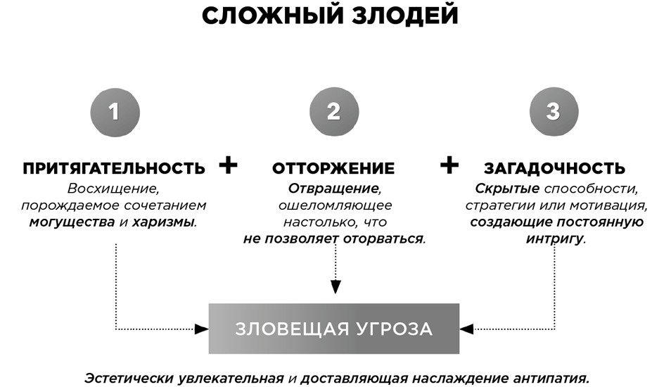 Смешение жанров происходит, когда переплетаются сюжетные линии разной жанровой принадлежности. Если основной сюжет в жанре экшен перемежается второстепенным сюжетом другого жанра, герою понадобятся дополнительные свойства характера, придающие ему бо́льшую сложность и объем. В распространенных вариантах смешения жанров экшен переплетается с дополнительными сюжетными линиями из криминального и дружеского жанров — «Люди в черном» (Men in Black), «Смертельное оружие» (Lethal Weapon), «Час пик» (Rush Hour). К центральному для протагониста героическому альтруизму эти «примеси» добавляют остроумие и бескорыстие, необходимые для дружбы, а также аналитические навыки детектива. Слияние жанров происходит, когда исход сюжетной линии в одном жанре определяется другим. Если, например, экшен-история сливается с одним из шести жанров, предполагающих изменения в персонаже, то по мере выполнения героической миссии нравственные принципы, мировоззрение и человеческие качества героя будут меняться к лучшему или худшему. В мультфильме «Ральф» (Wreck-It Ralph), например, нравственные принципы главного героя меняются, превращая его из плохого парня в хорошего. Персонаж популярной видеоигры «Мастер Феликс-младший» Ральф ненавидит отведенную ему роль злодея. Единственная в его жизни задача — быть громилой, которого изо дня в день, в каждой игре, побеждает герой, Мастер Феликс. Удрученный Ральф приходит в группу поддержки злодеев из видеоигр, скандирующих: «Я плохой, и это хорошо! Я никогда не буду хорошим, и это неплохо!» Ральф отвергает эту мантру и пытается добиться героической роли в другой видеоигре. В этой игре Ральф встречается с персонажем-девочкой, жизнь которой оказывается в опасности, и в момент кризиса он принимает инстинктивное решение пожертвовать своей жизнью ради нее. Тем самым он проявляет верх альтруизма — жертвует собой, не ожидая награды. Ральф проходит арку сюжета искупления — от вынужденного злодея до альтруистичного героя[2]. Еще дальше по пути слияния жанров идут «Стражи Галактики» (Guardians of the Galaxy), совмещая экшен и с сюжетом искупления, и с историей дружбы (поджанр любовной истории). Главные персонажи фильма превращаются из беспринципных нарушителей закона в героических друзей, каждый из которых готов отдать жизнь за другого. (Заметим, кстати, что в экшене отсутствует роль наставника. У действующих лиц в «Крепком орешке», «Челюстях», «Стражах Галактики» нет ни наставников, ни советчиков. Наставники часто играют вспомогательные роли в сюжете возмужания, одном из поджанров эволюции. Если экшен-сюжет сливается с историей взросления, главному герою действительно может понадобиться наставник — как Рей нужны были Люк Скайуокер и Йода в саге «Звездные войны».) При смешении или слиянии жанров характер персонажа усложняется, и одна грань его натуры оказывается важнее и заметнее других. Какая же из граней будет самой важной? Кто он — романтический герой или героический романтик? Это две разные личности. От того, как вы сбалансируете сюжетные линии, будет зависеть, какие стороны станут главенствовать, какие будут вспомогательными и как выстроится их взаимодействие.Злодейство. Дух нарциссизма