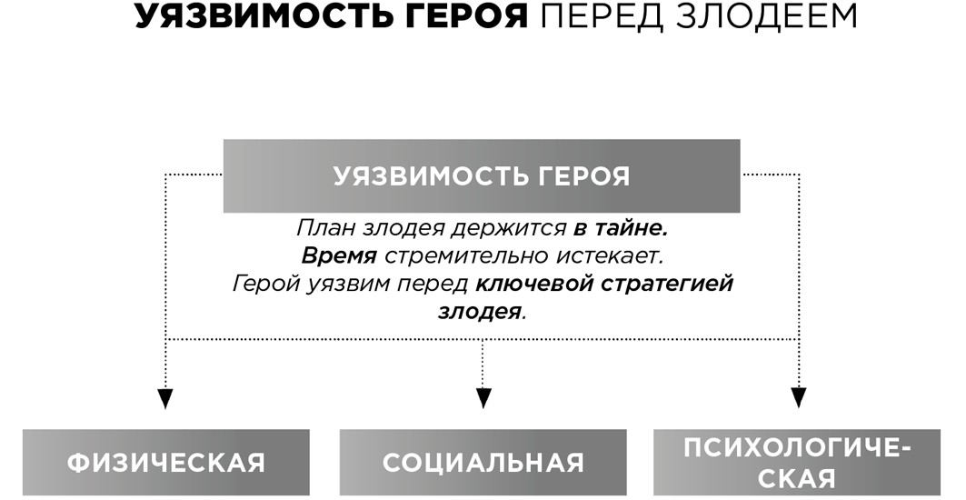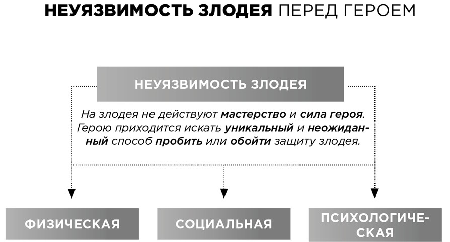Приспешников, как известно, нетрудно и перехитрить, и одолеть (см. франшизу «Джон Уик», John Wick). Когда расправу с героем поручают тупому головорезу, переломить ситуацию проще простого. В результате сцена власти рассыпается, оставляя читателя и зрителя в недоумении: «Если у злодея есть дела поважнее, мне-то тем более какой интерес?» Глубинный смысл сцены власти в том, чтобы противопоставить эгоманиакальной слепоте злодея самообладание и находчивость героя в критический момент. Для этого злодея и героя нужно столкнуть лицом к лицу — если не физически, то по крайней мере виртуально.2. Ахиллесова пята