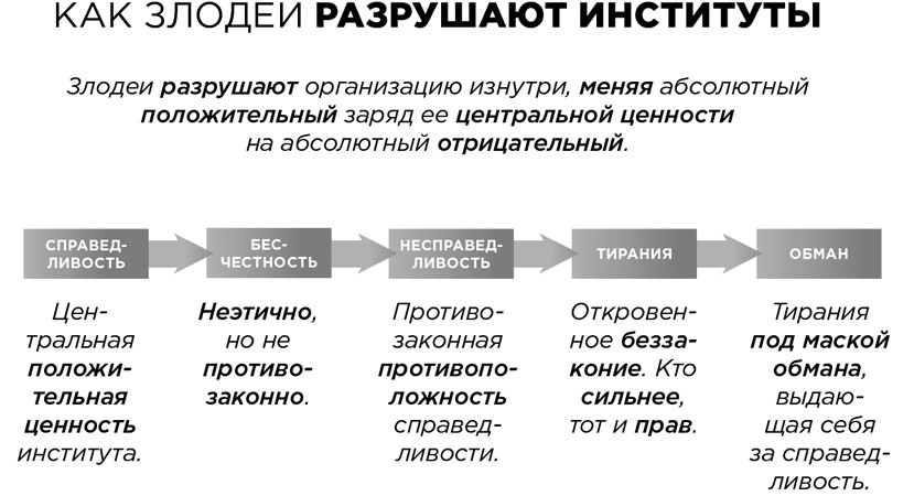 В этом внутреннем поджанре разложению подвергается весь огромный институт от руководителя до подчиненных, сверху донизу, создавая огромного многомерного злодея. Когда местом действия становится коррумпированный институт, борьба за свободу в противовес рабству ведется против самого устройства общества. Это значит, что автору придется продумывать масштабную всеохватную пирамиду власти, распределять действующих лиц по всем уровням, а затем разрабатывать командную вертикаль с вершины до самого основания и обратно. В «Голодных играх» (The Hunger Games) расточительная и развращенная столица государства Панем Капитолий не только властвует над двенадцатью окружающими ее стихийно сложившимися дистриктами, но своими законами и указами вынуждает героиню убивать всех на ее пути. В «Матрице» (The Matrix) обширный охват злодейству обеспечивает компьютерная симуляция реальности. Злодей не внутри матрицы, злодей и есть матрица. Оружие агентов Смитов — создание иллюзии реальности. Нео, Морфеус и Тринити ведут головоломную битву за свободу против машин, превращающих все человечество в рабов, которые не подозревают о своем рабстве. Бунтарь Нео, герой-макгаффин, пытается сокрушить эту систему, но агенты Смиты кажутся вездесущими и неистребимыми. Более того, любой член этого общества может внезапно превратиться в агента Смита.