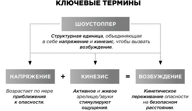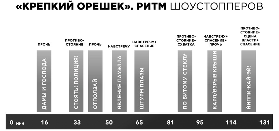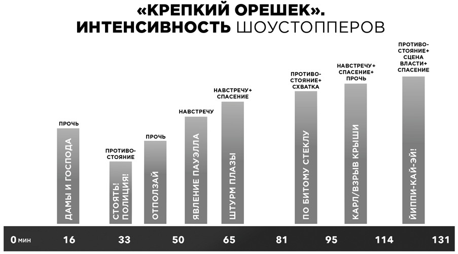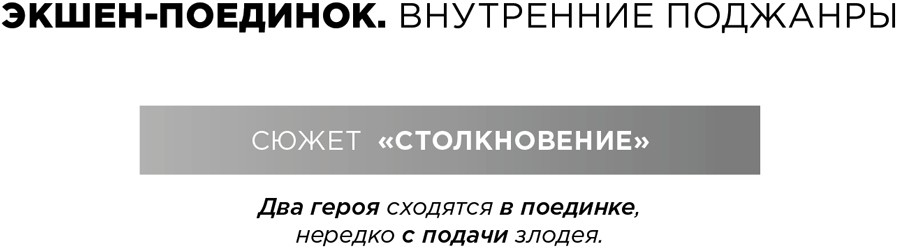 В части первой (Основные составляющие экшена) глава первая посвящена современной системе распределения историй по жанрам, которые делятся на две категории: первичные жанры (различающиеся содержанием) и презентационные (различающиеся формой выражения). В главах со второй по пятую рассматриваются основные составляющие первичных жанров — центральная ценность, центральные действующие лица, центральное событие, центральная эмоция — и их воплощение в экшен-историях. Основное внимание во второй части (Действующие лица экшена), состоящей из глав шестой и седьмой, уделено триаде тех самых сил, которые генерируют внутреннюю энергию экшена, — треугольнику «герой — злодей — жертва». В части третьей (Структурные принципы экшена), охватывающей главы с восьмой по шестнадцатую, разбирается композиция экшена, от побуждающего происшествия до кульминации. В части четвертой (Поджанры экшена), включающей главы с семнадцатой по двадцать третью, мы обращаемся к четырем поджанрам экшена, каждый из которых в свою очередь делится на четыре внутренних поджанра, и рассматриваем наиболее возвышенную форму экшена — высокое приключение. Часть четвертая завершается призывом к оригинальности. Несколько слов о примерах В качестве примеров во всех главах мы приводим произведения, завоевавшие популярность в свое время, но самое главное, наглядно и четко иллюстрирующие принципы и особенности жанра. Поэтому рекомендуем ознакомиться со следующими фильмами: «Крепкий орешек» (Die Hard), «Миссия невыполнима: Протокол Фантом» (Mission: Impossible — Ghost Protocol), «Терминатор» 1, 2 (Terminator I–II), «Назад в будущее» 1–3 (Back to the Future I–III), «Люди в черном» 1–3 (Men in Black I–III), сага «Звездные войны» (Star Wars), «Стражи Галактики» (Guardians of the Galaxy), «Темный рыцарь» (The Dark Knight), «Казино „Рояль“» (Casino Royale), «Матрица» (The Matrix), «Петля времени» (Looper) и «Мстители: Финал» (Avengers: Endgame).Пролог. Любовь к экшену