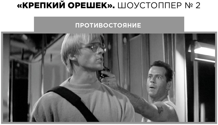 Эта сцена может выдерживать паузу столько, сколько понадобится, пока не заправится под завязку топливом высочайшего напряжения. До сих пор герою удавалось уходить от злодея невредимым, но в этой сцене, застывшей во времени, беззащитный, припертый к стене герой видит перед собой только торжествующий оскал злодея. Кажется, что все потеряно. Закономерный вопрос, касающийся сцены власти: почему злодей просто не убьет героя, пока может? Ответ нужно искать в главном недостатке злодея — нарциссизме. Тщеславие заставляет злодея злорадствовать, упиваясь незавидным положением героя, торжествовать, наслаждаясь собственным триумфом, и, возможно, пытать героя ради нужных сведений или просто из садистского удовольствия. Чем страшнее муки, тем сильнее напряжение. На пике противостояния сцена власти доводит конфликт до такого невыносимого предела, когда злодей, потрясая оружием, готовится сделать последний роковой шаг и истребить героя. Как же герою в мгновение ока превратиться из жертвы в победителя? Способов три: одолеть силой, одолеть умом или силой и умом в совокупности. Чтобы победить злодея, герой должен перебороть противника физически и, воспользовавшись отвоеванным преимуществом, одержать над ним верх в поединке. В фильмах про боевые искусства других вариантов практически не бывает. Однако в китайской литературе можно найти много шедевров экшена, таких, например, как «Легенда о героях Кондора». Ее автор Цзинь Юн в своих произведениях смешивает и объединяет героику с такими жанрами, как военный, политический, любовный, а также с эволюционным сюжетом. Его главные герои побеждают злодеев и боевым искусством, и пониманием психологии. Чтобы перехитрить злодея, герой должен найти у него слабое место и, нацелившись в эту точку, пробить броню. Во многих случаях таким слабым местом оказывается избыток силы или инерция, и тогда герой, как в дзюдо, обращает направленный на него удар против самого нападающего. Одно из самых распространенных уязвимых мест злодея — самомнение. Когда успех ударяет ему в голову, он теряет бдительность, а с ней и несокрушимость. В сцене власти в «Крепком орешке» (Die Hard) герою удается одновременно и перехитрить злодея, и побороть. Сперва окровавленный безоружный Джон Макклейн делает неожиданно ловкий ход: отвлекает злодеев, Ганса Грубера и его приспешника Эдди, хохоча над нелепостью ситуации. Затем, когда злодеи в ответ на этот смех тоже закатываются хохотом, Макклейн одолевает их, выхватив скрытый у него на спине пистолет — убивает Эдди и ранит Ганса. Затем герой и злодей вступают в схватку один на один, и Макклейн сбрасывает Ганса с тридцатого этажа Накатоми-Плазы.