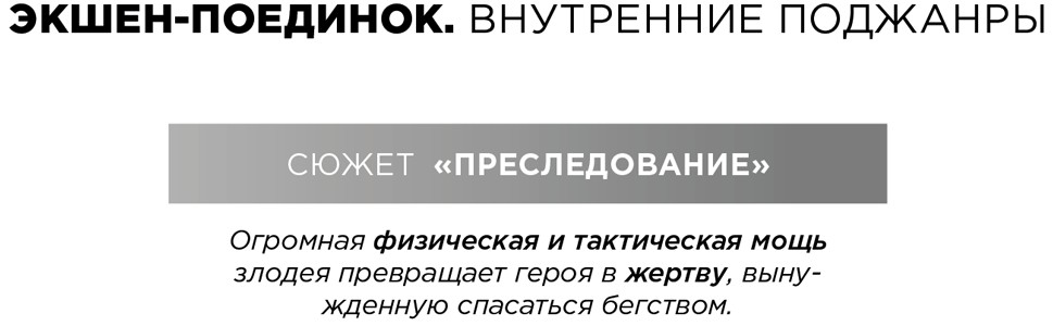 Герой-жертва в сюжете преследования (например, Эллен Рипли в «Чужом», Alien) вынужден спасаться, постоянно уходя от опасности, которую несет с собой преследующий его злодей. В сюжете преследования самым естественным образом сливаются такие жанры, как экшен / научная фантастика и экшен/хоррор. В «Гневе Хана» (The Wrath of Khan) Кирк сталкивается с Ханом в космической глухомани, вдали от безопасной территории Федерации. Таким злодеям, как Хан, просто некогда выстраивать институты или поддаваться соблазнам тирании. Они просто стирают в порошок любого, кто встает между ними и предполагаемой добычей. Когда сюжет преследования совмещается с сюжетом заговора, злодей обманом подключает общество к погоне за героем — как в «Беглеце» (The Fugitive). Если сеттинг экшен-истории не предполагает институциональной власти, автор должен придумать оружие и тактику, которые будут менять заряд в сценах неизбитыми, сложными способами. Злодей в «Терминаторе 2» (Terminator 2), например, располагает почти безгранично разнообразным арсеналом. Загадочные злодеи вроде Хищника держат свою тактику преследования в тайне — до самого нападения, которое всегда оказывается внезапным. Реакция застигнутого врасплох героя, вынужденного выкручиваться на ходу, разгоняет возбуждение от сцены к сцене.