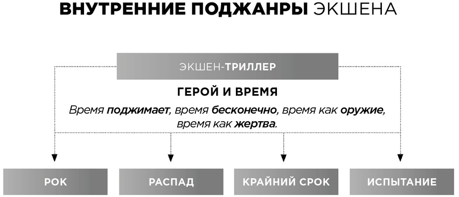 Часы, минуты, секунды мастерски взвинчивают возбуждение, расставляя на пути героя темпоральные ловушки. Время — это то, что мы называем переменой. День сменяется ночью, одно время года — другим, жизнь — смертью, так меняется мир и все, что в нем есть. Этот процесс измеримых перемен для нас и есть время. Оно обладает монаршей властью над людьми: мы его подданные, оно нами правит, мы преклоняемся перед ним. Время может тянуться медленно или пролетать как один миг, а в фантастических мирах может идти не только вперед, но и обращаться вспять или ответвляться вбок, в страну вечных грез. Однако в реальной жизни ход времени и его назначение нам не подчиняются. Природа подстраивается, время берет свое. В отличие от природы, которую мы нередко воспринимаем как нечто живое и обладающее замыслом — иногда смертоносным, — время вряд ли кажется нам живым существом, способным откликаться на наши действия. Но когда экшен-история наделяет время замыслом, все то, что казалось случайным, лишенным смысла и безобидным, становится намеренным, осмысленным и губительным. Время правит действительностью, и мы повинуемся его державному первому закону: все должно меняться. Поджанр экшен-триллера делится на четыре внутренних поджанра в зависимости от роли, темпа и назначения времени — Рок, Распад, Крайний срок, Испытание.